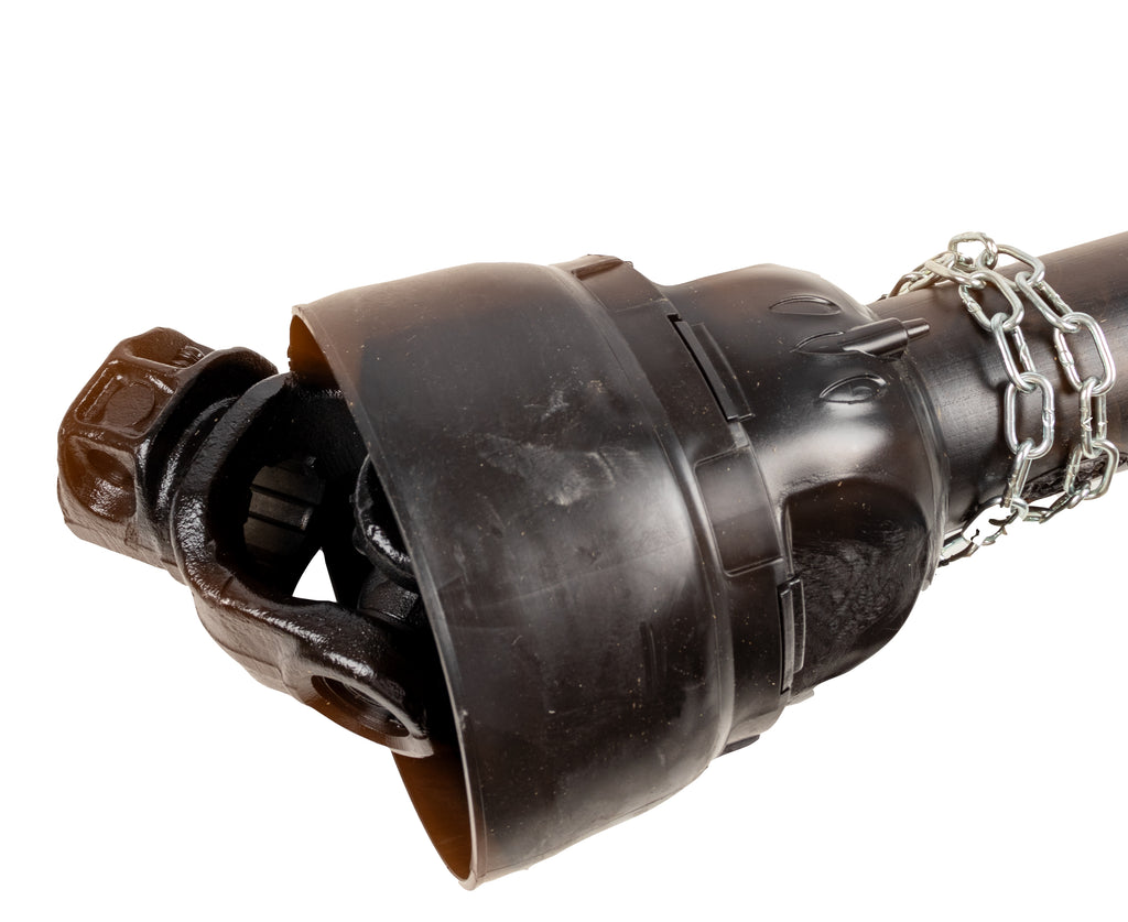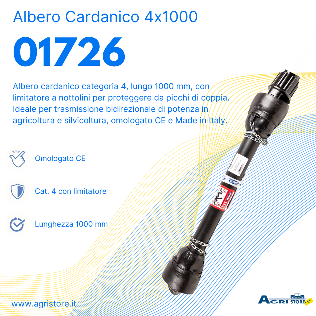Albero cardanico di categoria 4, lungo 1000 mm con dispositivo di sicurezza limitatore a nottolini posto sul giunto cardanico lato attrezzo. Permette la trasmissione di coppia bidirezionale in modo tale da evitare picchi di coppia improvvisi (ingolfamento dell’attrezzo) che possono pregiudicare la resistenza e la durata dei componenti.