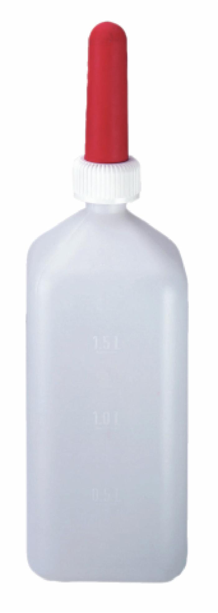 Bottiglia biberon da 2 lt per l'allattamento dei vitelli con tettarella rossa, senza manico.