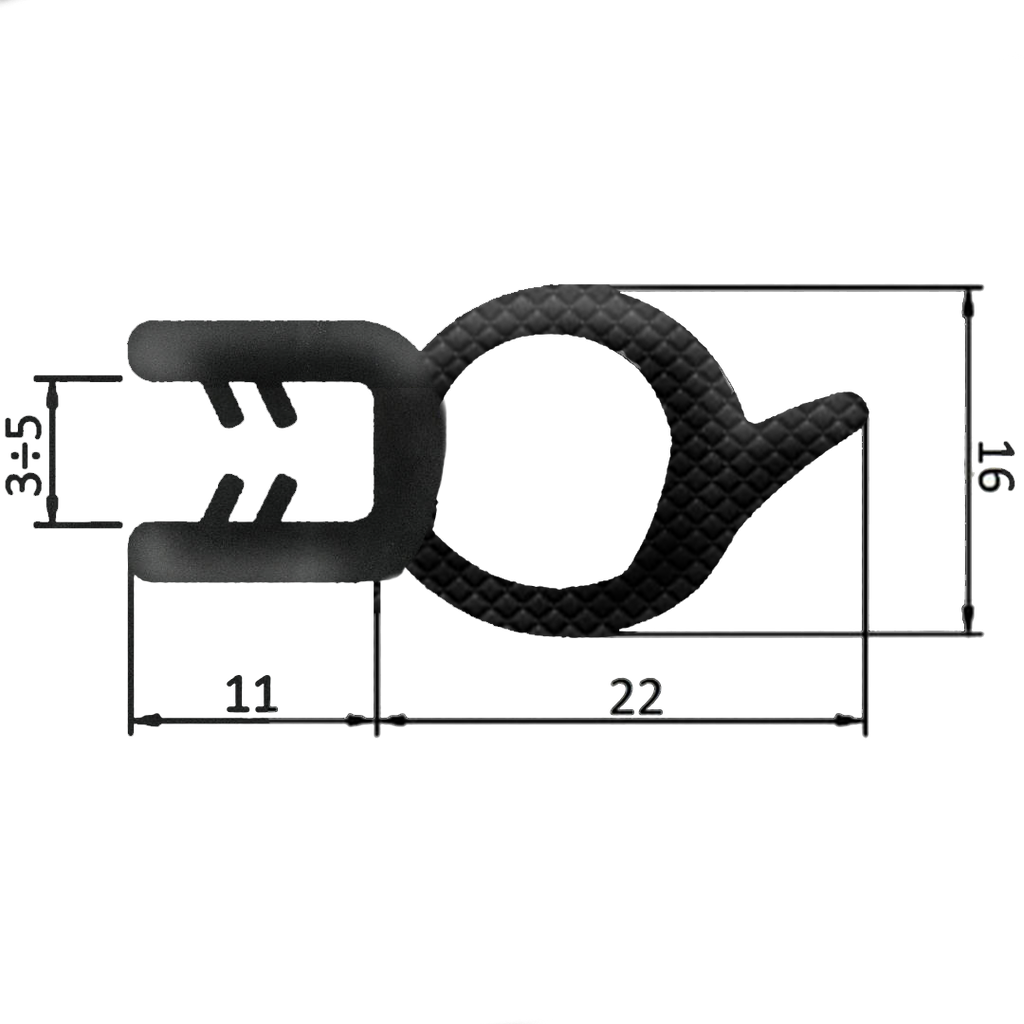 Guarnizione per lamiera o ABS con aggancio da 3 mm a 5 mm, rotolo da 20 metri.