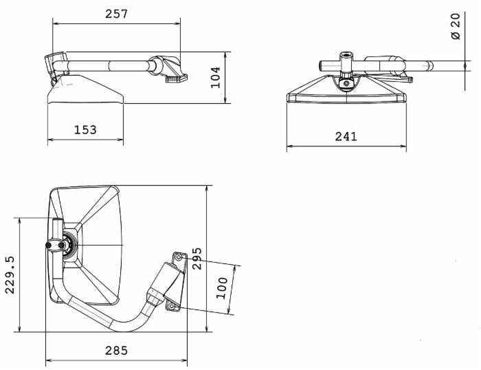Specchio retrovisore sinistro, dimensioni 285x295, Ø braccio 20 mm, testa retrovisore 160x250 mm.