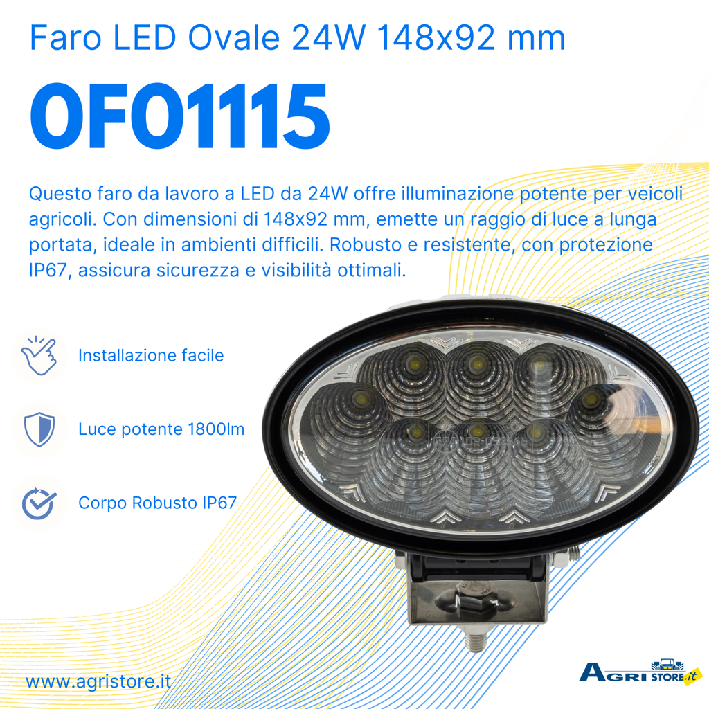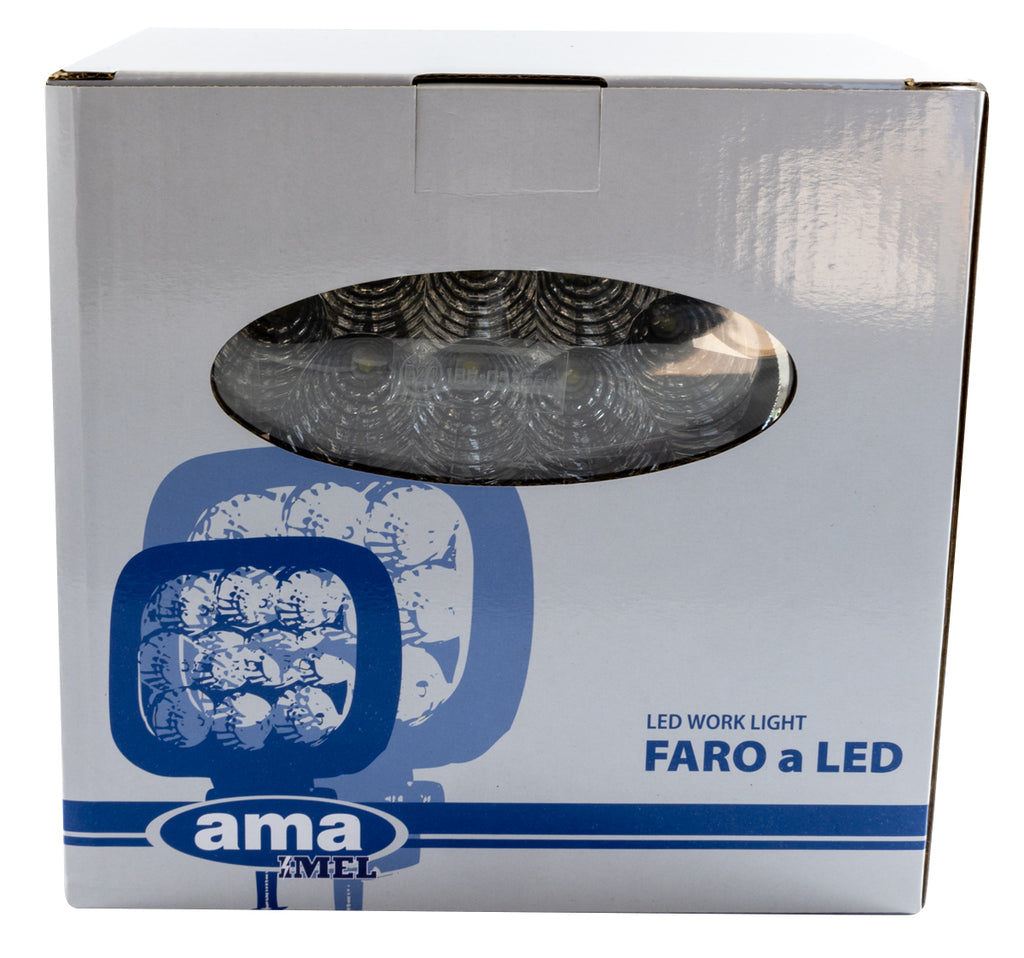 Faro da lavoro a LED con una potenza di 24 W, progettato per fornire illuminazione affidabile su veicoli e attrezzi agricoli.