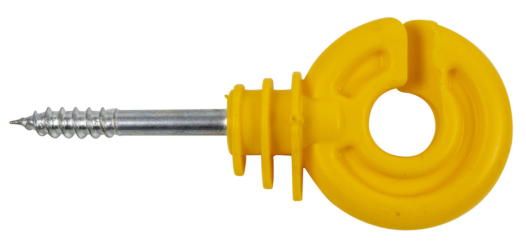 Isolatore ad anello per recinti elettrici dotato di vite corta con diametro 5 mm, facile da avvitare su pali in legno. Il supporto largo per il filo lo rende adatto a corde, fili o nastri fino a 10 mm. Realizzato in plastica di colore giallo.