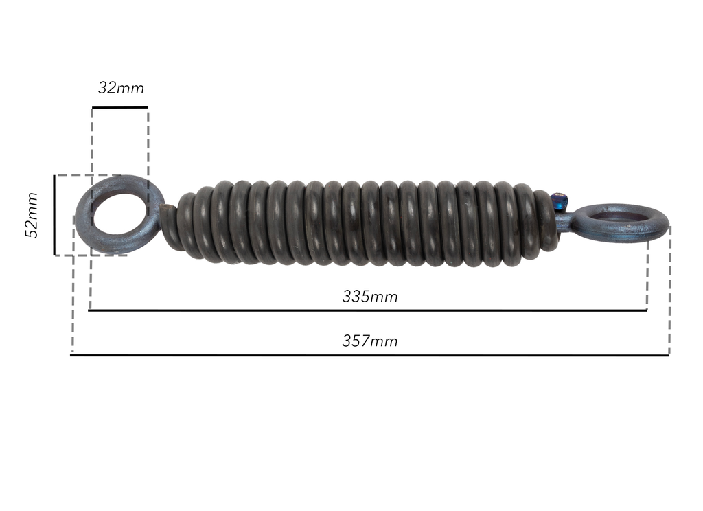 Questo prodotto dispone di una lunghezza totale di 357 mm, di un diametro interno dell'occhio girevole di 32 mm e di un diametro esterno della molla di 52 mm.