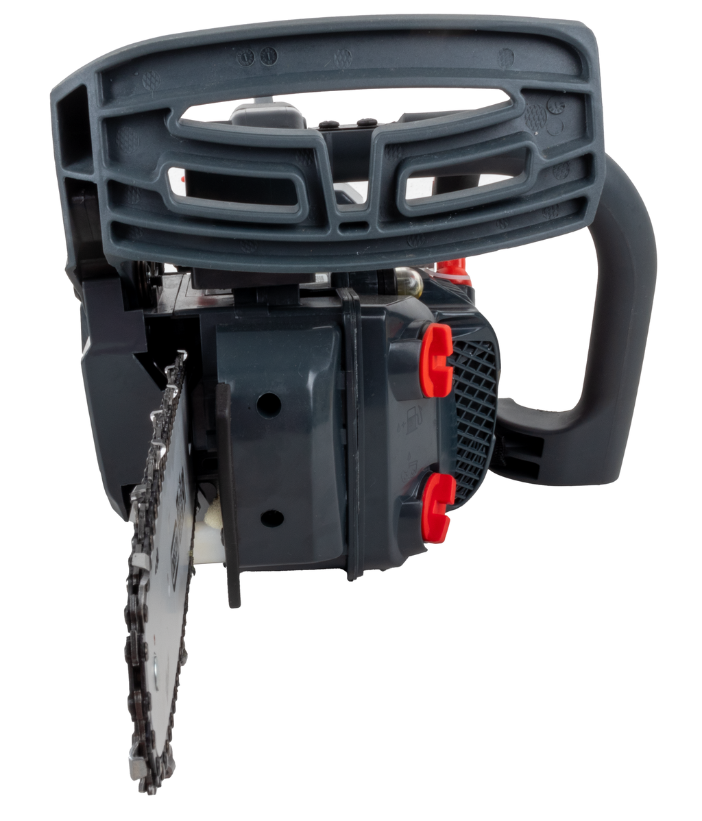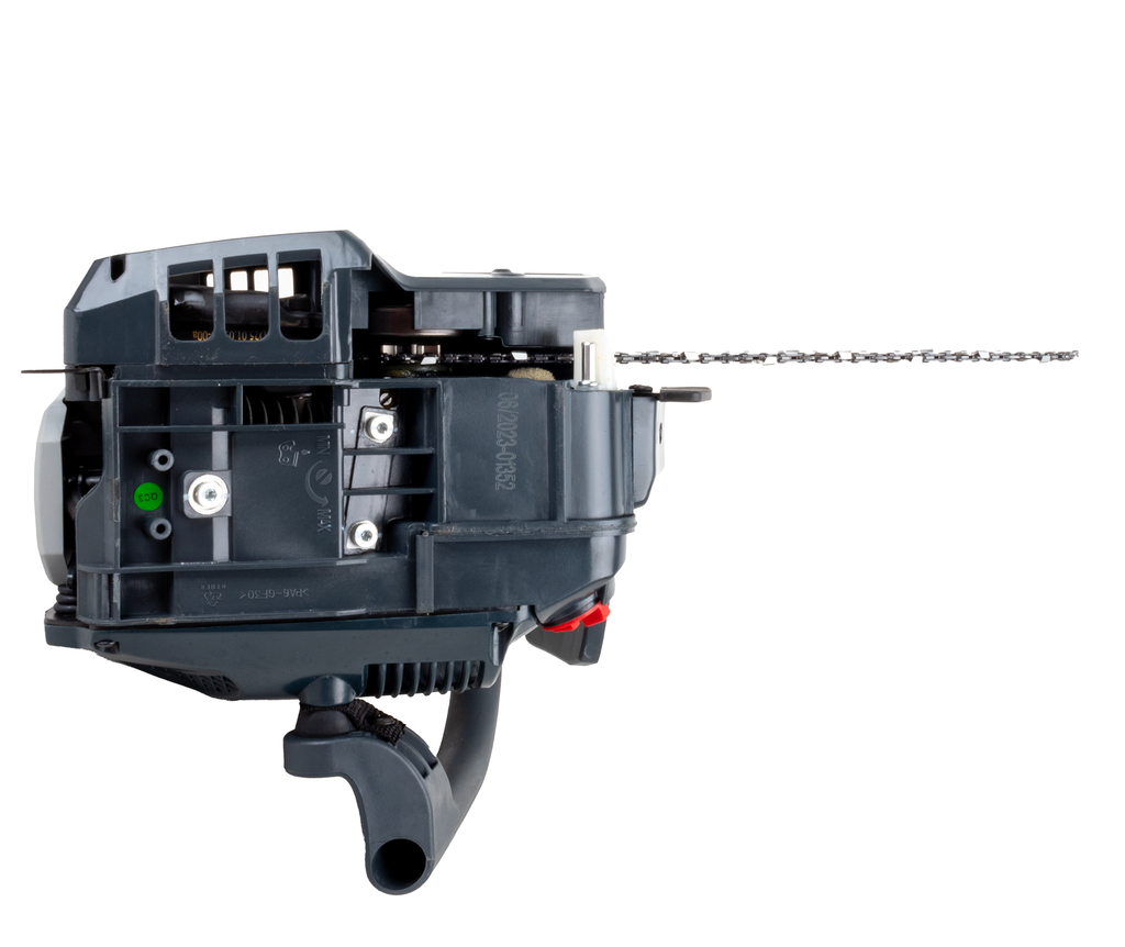 L'impugnatura alta in gomma antiscivolo e il dispositivo kick-off, che interviene in caso di rimbalzo della motosega, assicurano una presa salda e la massima sicurezza per l'operatore durante l'utilizzo.