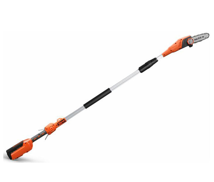 Pruner a batteria Redback 40V E608D con impugnature ergonomica e barra da 20 cm (8"). Ottimo bilanciamento del peso con motore e batteria posti al termine dell'asta. Lavora mediamente 55 minuti con una sola ricarica della batteria da 4 Ah.