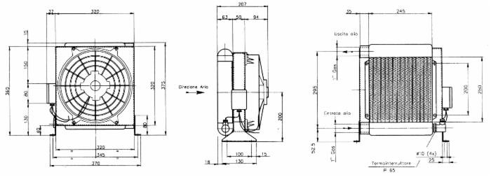 Scambiatore di calore in alluminio per portate da 25 a 150 lt/min con elettroventola da 12VDC.