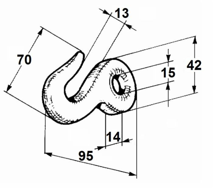 Uncino capo catena, diametro foro Ø15mm e lunghezza totale L= 95mm.