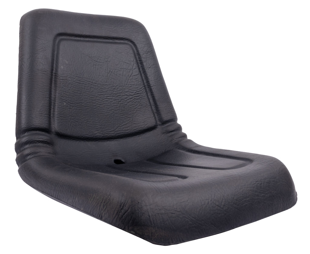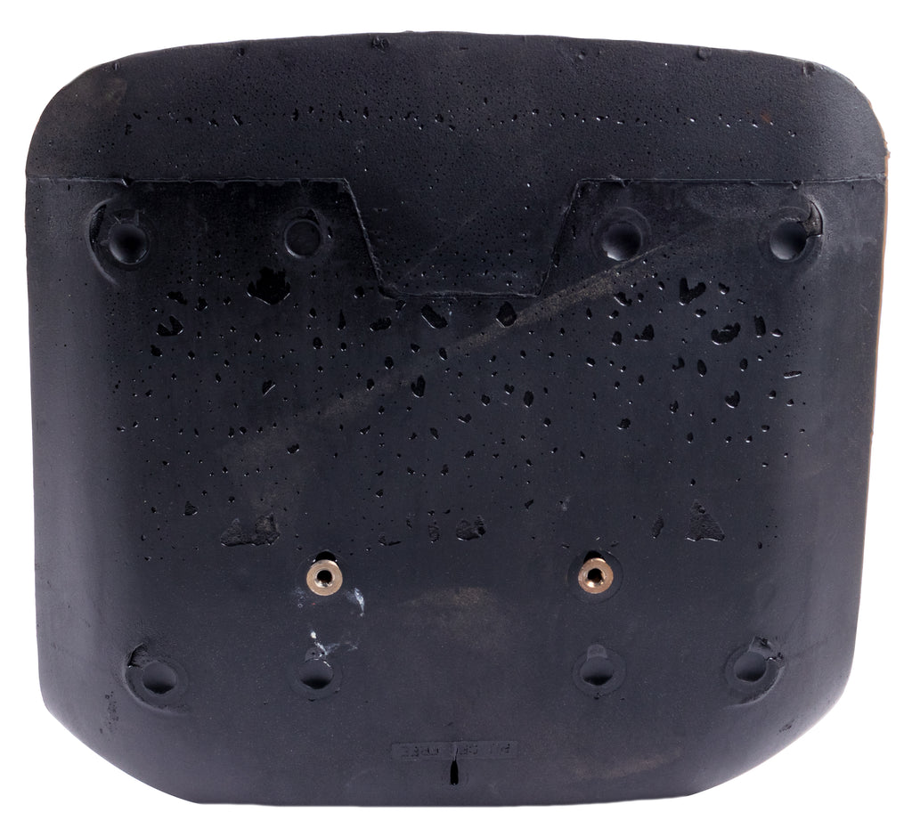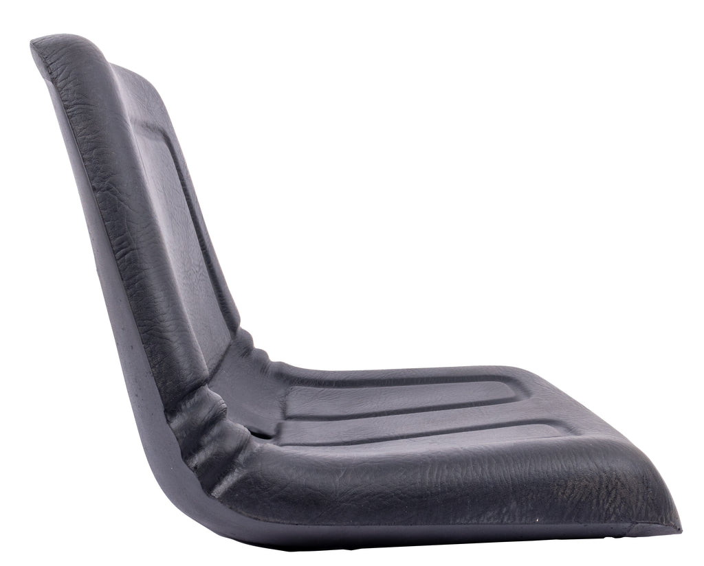 Sedile per macchine da giardinaggio e di pulizia industriale. Il rivestimento è in poliuretano integrale di color nero. Il telaio presenta un inserto metallico interno che serve per dargli una struttura.