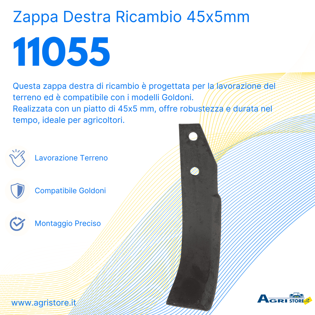 Questa zappa destra di ricambio per fresa, progettata per la lavorazione del terreno, è una componente essenziale per mantenere alte le prestazioni. Adattabile al marchio Goldoni.
