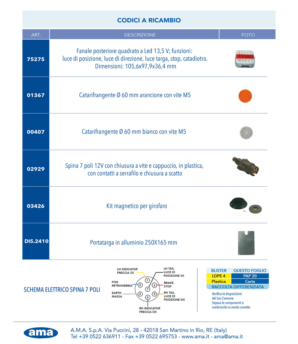 Kit luci posteriori LED 12V, cavo lunghezza 7,6 m + 2,5 m tra fanali, con connettori 6 poli di collegamento cavi , spina 7 poli, catarifrangenti rotondi arancioni e bianchi e portatarga. Confezionato in blister. Questo kit luci magnetico è perfetto per agricoltura, veicoli trasporto merci, rimorchi, macchine agricole. Posteriore, con magnete.