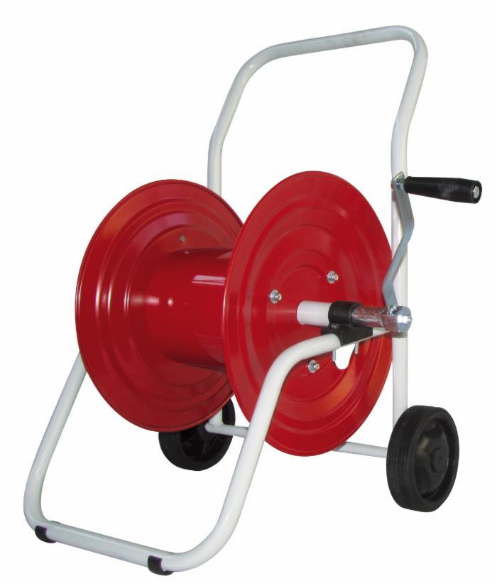 Avvolgitubo per tubi con lunghezza massima 55 m. Entrata presa rubinetto per attacco rapido in plastica, uscita raccordo da 15 mm in ottone, ruote in plastica da 160 mm.