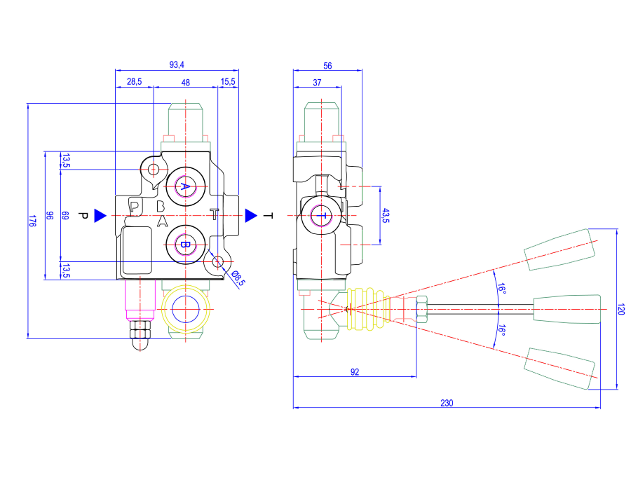 Distributore oleodinamico Ama modello Basic da 3/8" a 1 leva. Circuito semplice effetto con ritorno a molla, portata 40 litri e pressione massima 180 bar.
