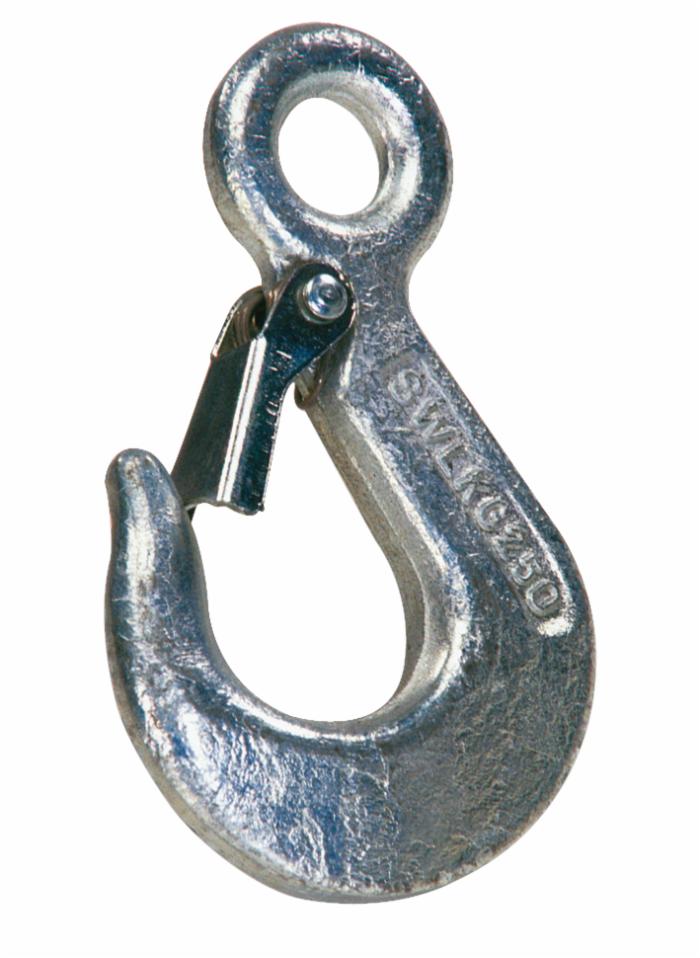 Il gancio ad occhio con sicura, realizzato in resistente acciaio al carbonio, offre una sicura soluzione per sollevamenti con una portata massima di 1600 kg.