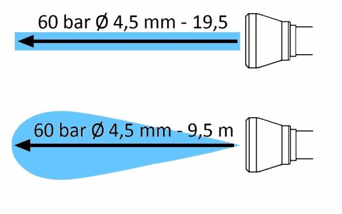 Lancia lunga gittata, lunghezza 700 mm, fornita con protezione, ugello cono M15x1 lunga gittata, foro Ø 4,5, ttacco filettato 1/2". Caratteristiche: Foro massimo ugello Ø 5,5 mm , gittata massima cono (ugello foro Ø 4,5 mm, 60 bar) mt.9,5, gittata massima spillo (ugello foro Ø 4,5 mm, 60 bar) mt.19,5. Può montare il raccordo girevole 1/2"-1/2". Pressoine 60 bar art.11121.