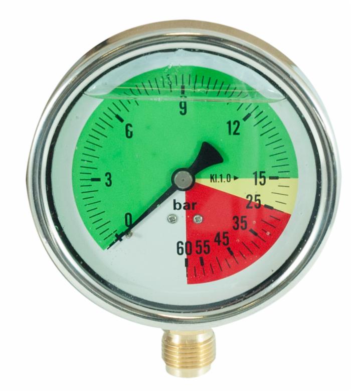 Manometro isometrico alla glicerina con cassa in acciaio inox Ø 100 mm, attacco radiale M1/2" gas, scala 0-15/60 bar colorata.