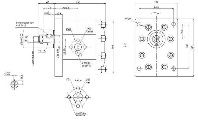 Pompa ad ingranaggi gruppo 3 da 32cc destra "modello standard" con coperchio e base in ghisa, corpo in alluminio. Flangia standard Europea ad albero conico 1:8. Attacchi a flangia. Tipo Plessey C72