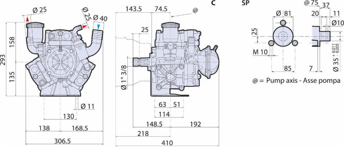 Pompa AR 135BP/C per impiego con barre diserbo, in alluminio con condotti esterni plastificati, 3 membrane semidrauliche con camera aria.
