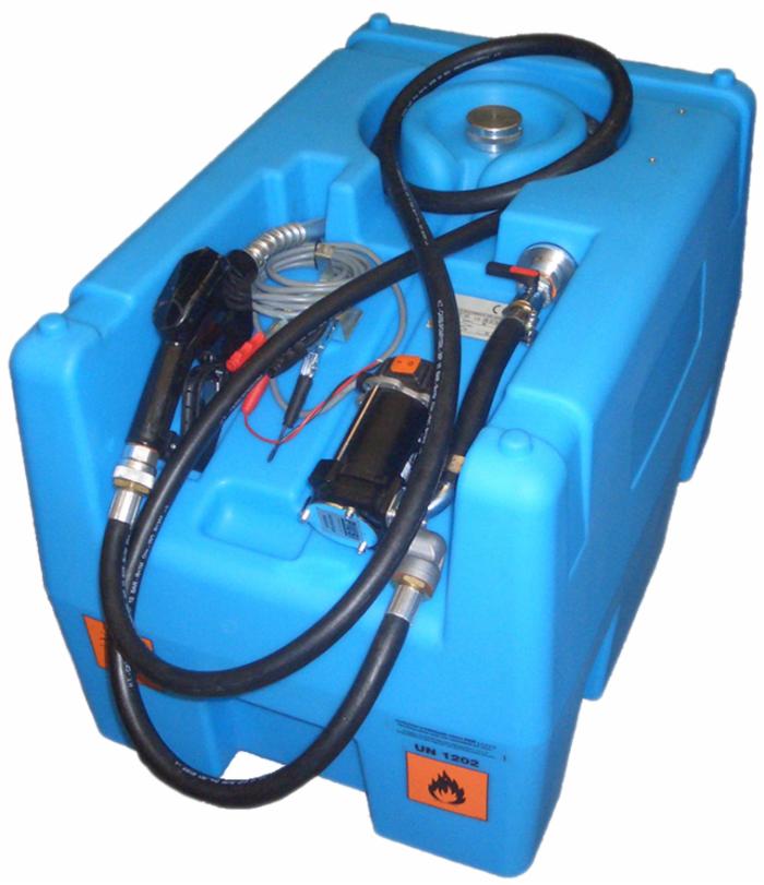 Contenitore per il trasporto del gasolio. Realizzato in polietilene con capacità di 220 L, munito di pompa da 12V con portata da 45 lt/min.