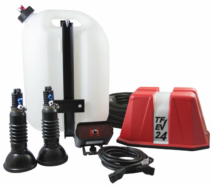 Tracciafile con serbatoio da 24 L e spruzzatori verticali che garantiscono una schiuma più resistente. Composto da: compressore aria 12 Vdc, compressore a membrana con cofano in Abs rosso, serbatoio in polietilene alta resistenza da 24 L completo di tappo con valvola di sicurezza pretarata in plastica, valvola di non-ritorno a membrana e regolatore di flusso, tubazione aria-liquido con tubi 6x4 ricoperti da guaina morbida, spruzzatori schiuma verticali alti 150 mm, con diffusore e supporti regolabili, interruttore con indicazione lato funzionamento e fusibile di protezione, cavi di alimentazione da 2 m, cavi al compressore da 5 m.