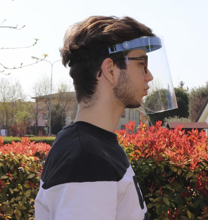 Visiera regolabile in policarbonato trasparente, colore azzurro. Fornisce protezione al volto e agli occhi da eventuali agenti patogeni: impedisce a particelle di saliva, schizzi e spruzzi di entrare a contatto con il volto di chi la indossa, garantendo una buona aerazione.